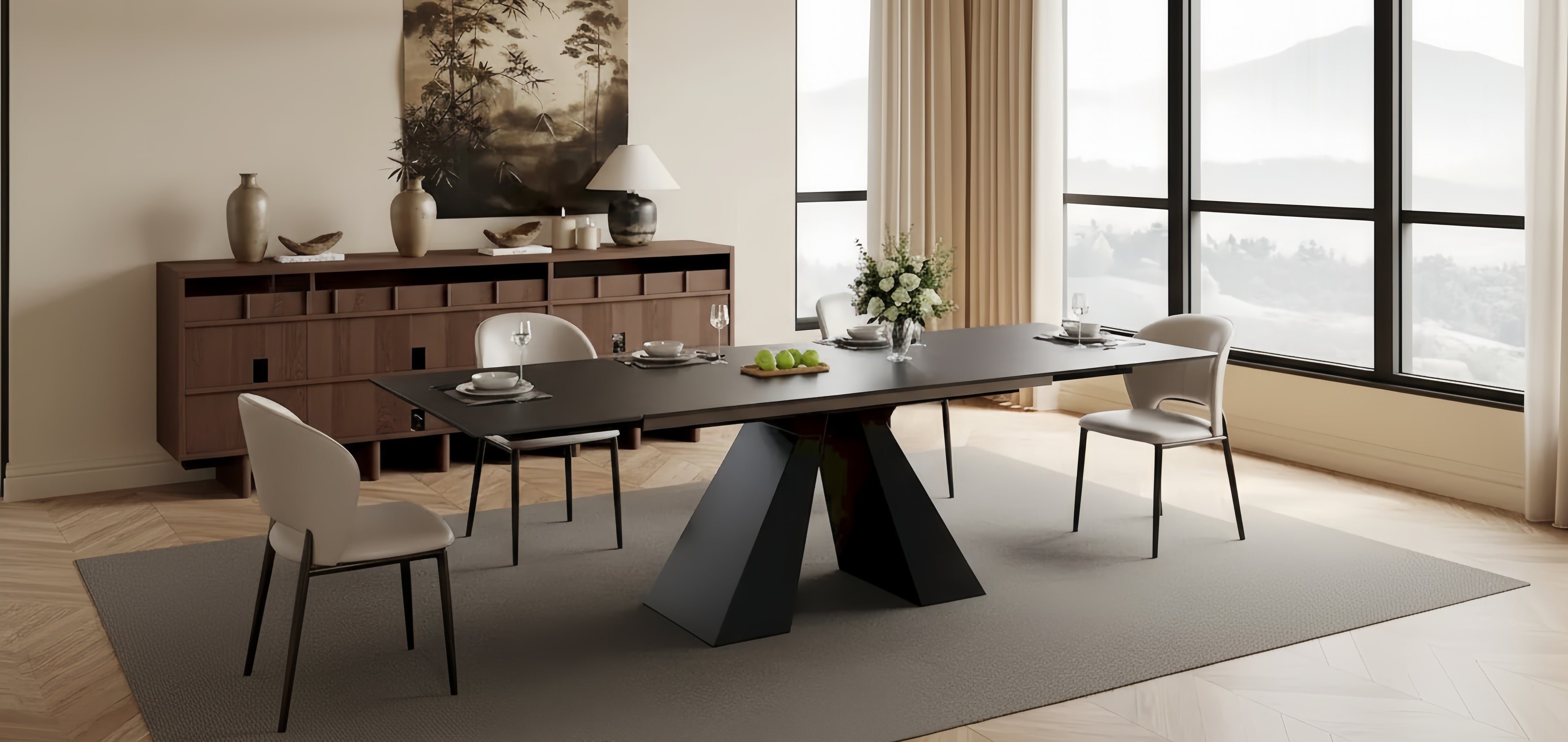 Le plateau de table gris mat est plus texturé. Le piètement en acier carbone noir en forme de V inversé souligne le style moderne et assure la stabilité.
